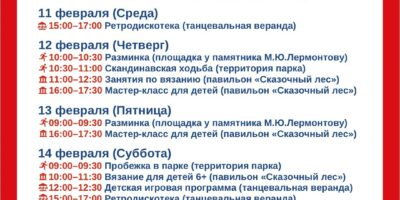 Системное расписание на неделю с 9 по 15 февраля. Приглашаем вас в наш парк!!! Пн,Пт — вы можете принять участие в открытой тренировке по скандинавской ходьбе. Для записи можно связаться с тренером +7 962 985 8258 (Владимир Васильев) В Субботу вас ждет детский праздник и мастер-класс. а вот в Вс — на квизе, который пройдет […]