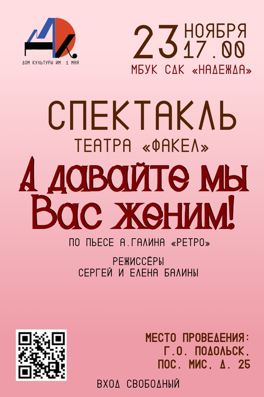 Приглашаем жителей и гостей нашего города на спектакль театра «Факел» «А давайте мы Вас женим!»
