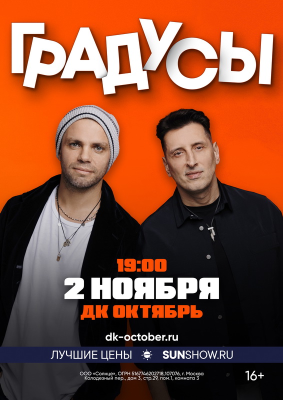 Купив билет на концерт группы «Градусы», вы подарите себе вечер, который ещё долго будет вспоминаться своим позитивом, оригинальностью, весёлым и легким отношением к жизни.