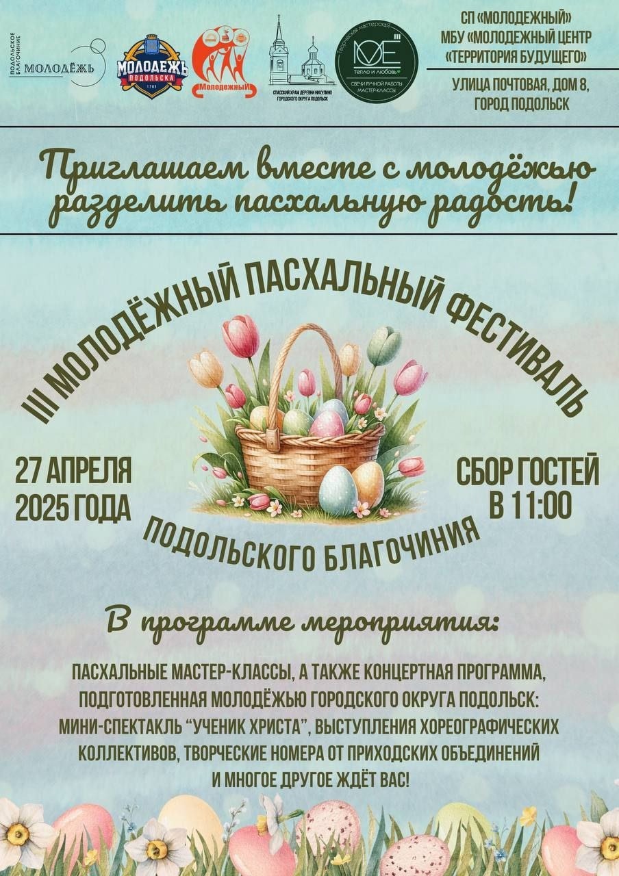 III Молодёжный Пасхальный фестиваль #ТерриторияБудущего #Афиша The event is finished. Дата 27 Апр 2025 Expired! Время 11:00 Места МУ ДТМ СП "Молодежный" Почтовая улица, 8, Подольск Поделиться событием