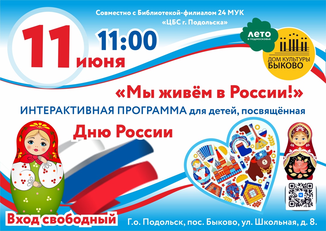 В преддверии Дня России приглашаем юных патриотов на интерактивную программу «Мы живём в России». Детей ждут викторины, танцы, игры и творческие задания. Ребята узнают много нового о России. Кульминация праздника — конкурс рисунка на асфальте, где юные художники смогут выразить своё видение Родины. Присоединяйтесь к нам, чтобы сделать День России ярким и незабываемым!🇷🇺
