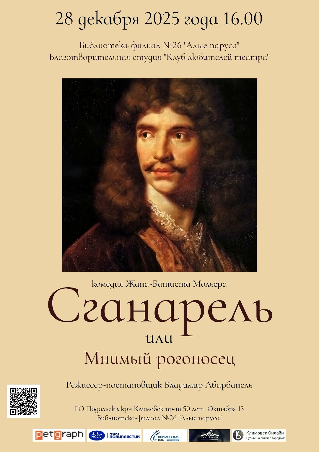 28 декабря и в честь 404-й годовщины со дня рождения великого комедиографа Жана-Батиста Мольера благотворительная студия «Клуб любителей театра» сыграет в библиотеке №26 комедию «Сганарель, или Мнимый рогоносец».