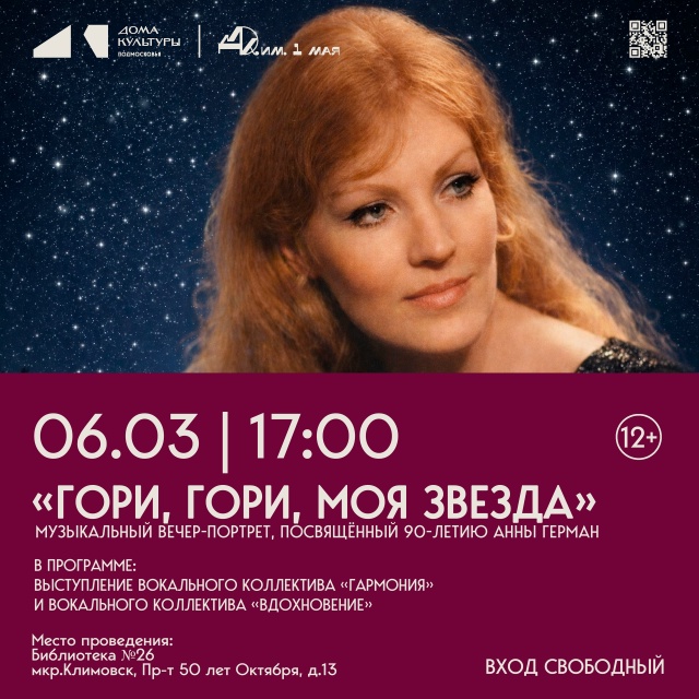Приглашаем жителей и гостей нашего города на музыкальный вечер-портрет, посвящённый 90-летию Анны Герман.