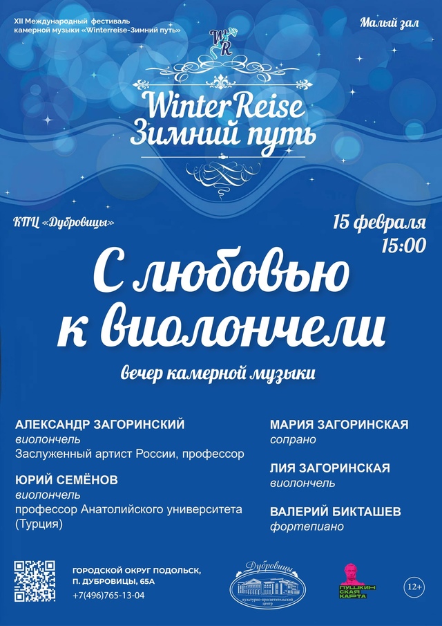 ✨ 15 февраля в 15:00 Культурно-просветительский центр «Дубровицы» приглашает вас в малый зал на вечер камерной музыки, где состоится концерт «С любовью к виолончели» в рамках XII Международного фестиваля камерной музыки «Winterreise-Зимний путь».
