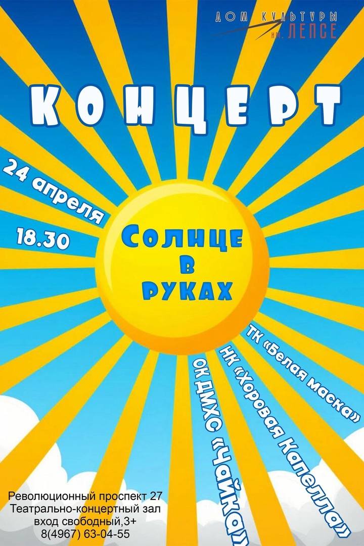 24 апреля в 18:30 состоится концерт “Солнце в руках”, который подарит вам массу ярких эмоций и впечатлений.
