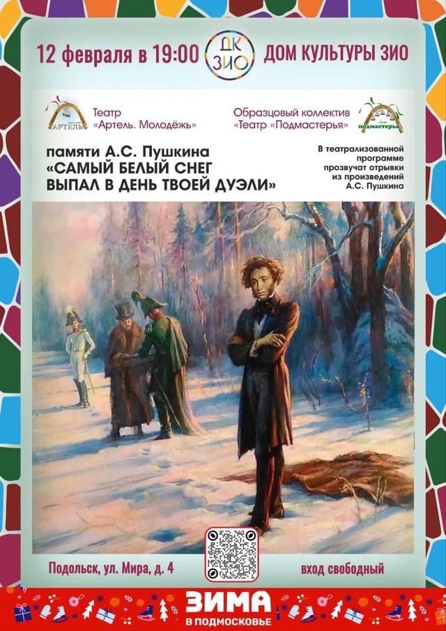💬 В Доме культуры ЗИО состоится традиционный костюмированный вечер в память о трагической дуэли А. С. Пушкина под названием «Самый белый снег выпал в день твоей дуэли». В ходе мероприятия артисты театра представят письма, документы и воспоминания, погружая зрителей в атмосферу последних моментов жизни великого Поэта. Также прозвучат отрывки из его произведений, которые вновь откроют его выдающийся поэтический и пророческий дар.