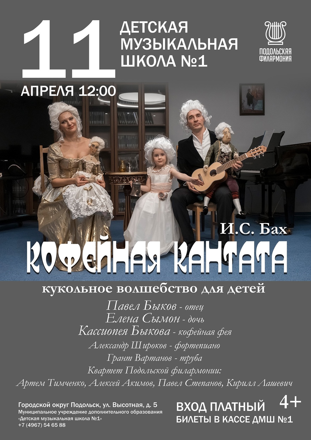 «Кофейная кантата» И.-С. Баха: кукольное волшебство для детей. Яркий кукольный спектакль по мотивам шутливой кантаты Баха переносит зрителей в XVIII век, где разыгрывается забавный конфликт между капризной юной Лизеттой и её ворчливым отцом-шарманщиком, запрещающим дочери пить модный, но безумно дорогой кофе. Постановка оживает благодаря традициям европейского оперного кукольного театра: изящные куклы (в духе итальянских театров д’Эсте и немецких ярмарочных представлений) танцуют, поют арии Баха и вовлекают детей в весёлую интригу.