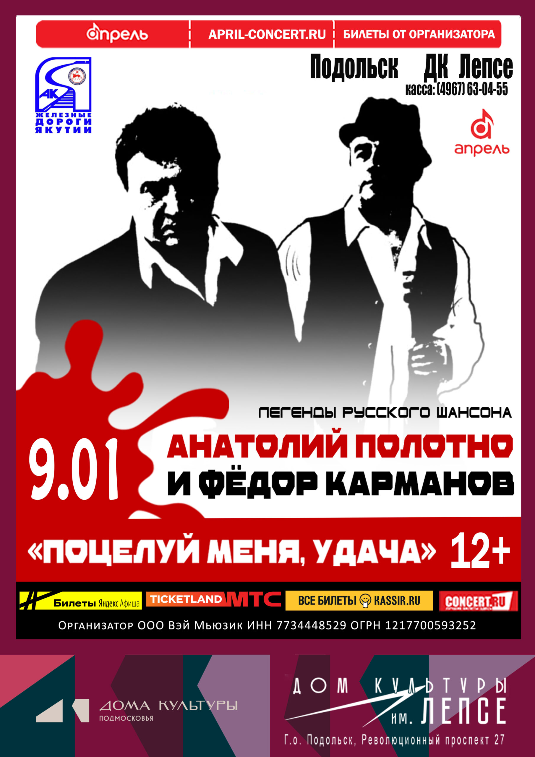Легенды русского шансона Анатолий Полотно и Федя Карманов выступят с программой «Поцелуй меня удача» в городе Подольск, ДК Лепсе.