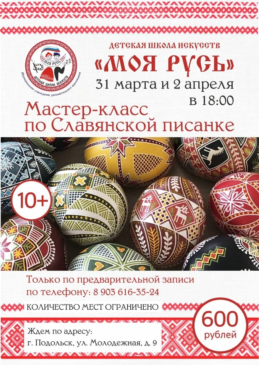 2 апреля в 18.00 часов. в Детской школе искусств «Моя Русь» состоится мастер-класс по Славянской писанке.