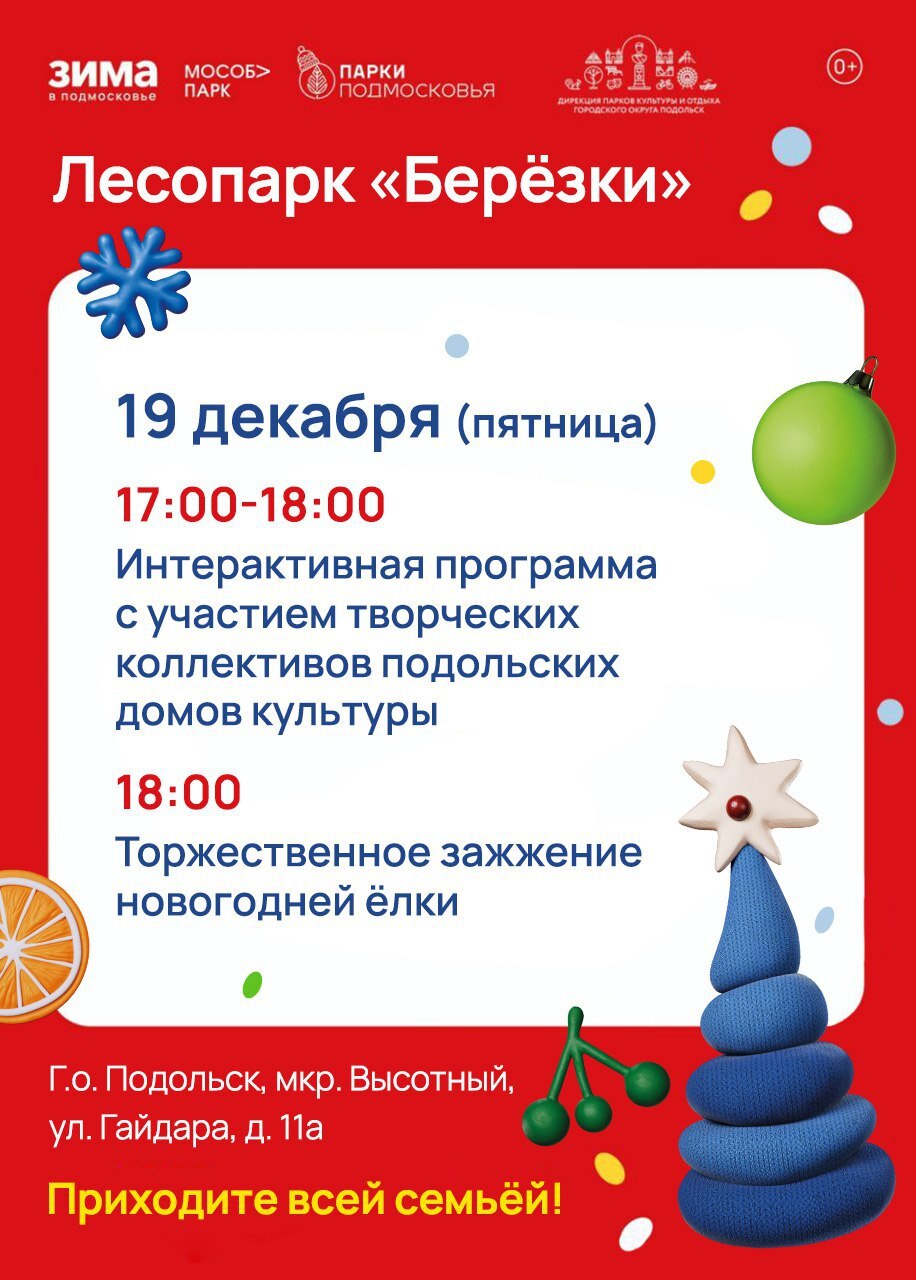 Так, в 17:00 на территории парка проведут интерактивную программу с участием творческих коллективов, а в 18:00 зажгут главный символ праздника – большую новогоднюю елку.