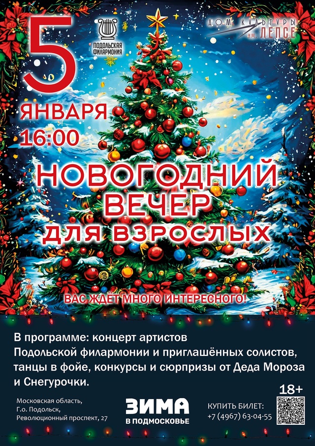 Новогодний вечер для взрослых The event is finished. Дата 05 Янв 2025 Expired! Время 16:00 Места Дом культуры им. Лепсе. Подольск Г.о.Подольск, Революционный просп., 27 Поделиться событием