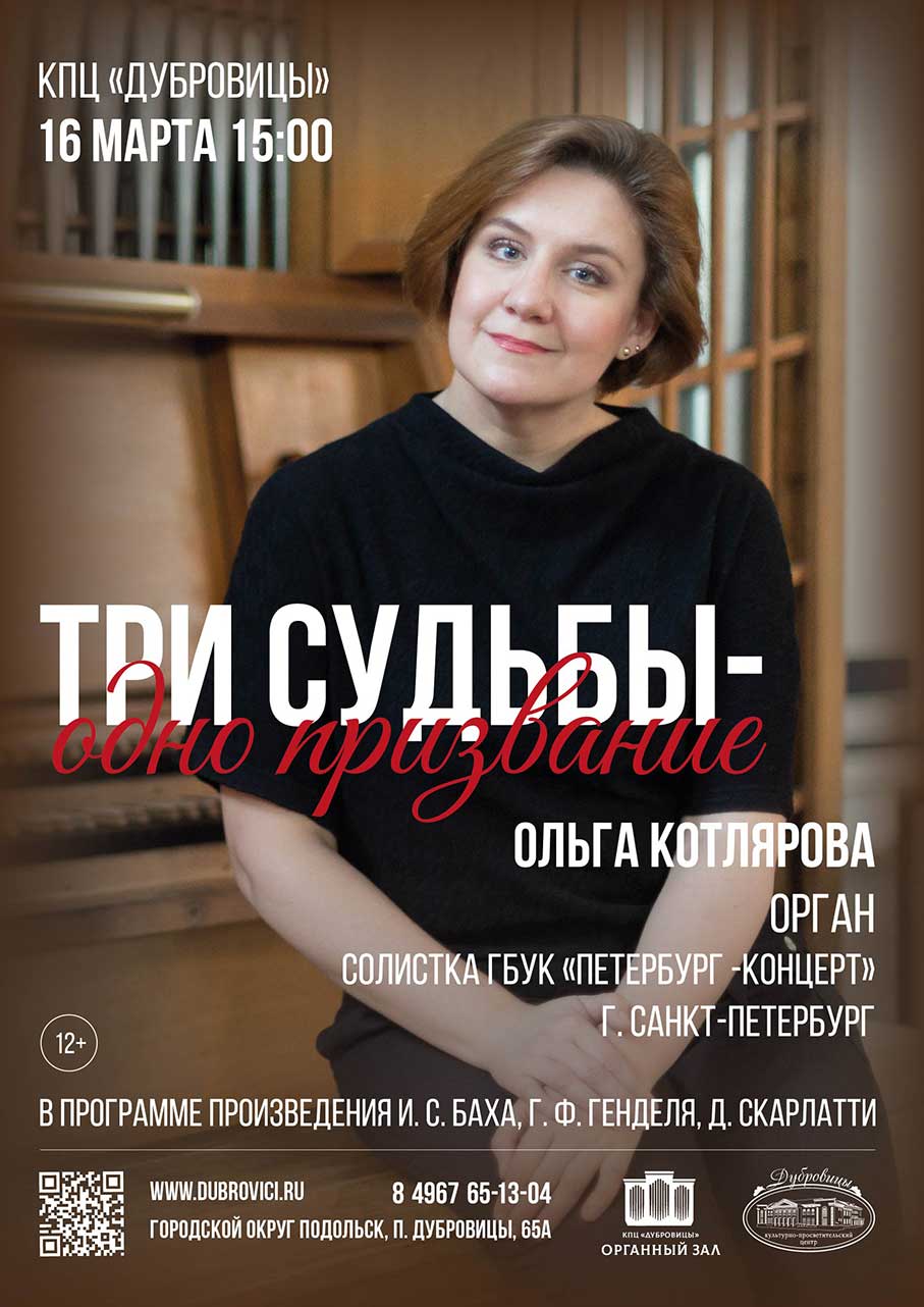 Органный концерт представит Ольга Котлярова, солистка ГБУК «Петербург -концерт» (орган, г. Санкт-Петербург). В программе произведения И. С. Баха, Г. Ф. Генделя, Д. Скарлатти.