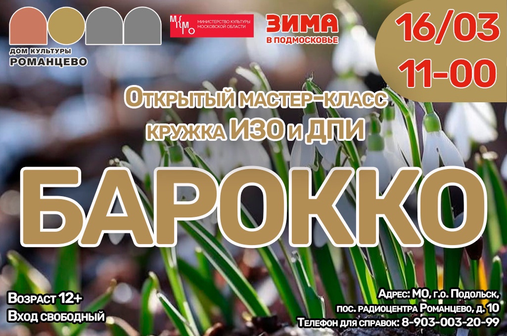 16 марта в 11-00 МБУК «СДК «Романцево» и библиотека-филиал №21 приглашают всех желающих на открытый мастер-класс кружка изобразительного и декоративно-прикладного искусства «Барокко».