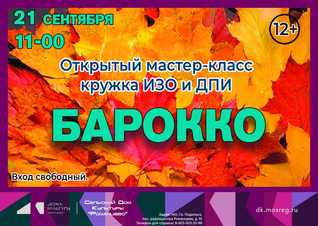 21 сентября в 11-00 МБУК «СДК «Романцево» и библиотека-филиал №21 приглашают всех желающих на открытый мастер-класс кружка изобразительного и декоративно-прикладного искусства «Барокко».