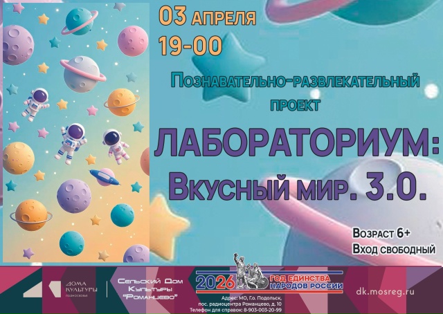 03 апреля в 19-00 МБУК «СДК «Романцево» приглашает на очередную встречу познавательно-развлекательного проекта «Лабораториум: Вкусный мир. 3.0».