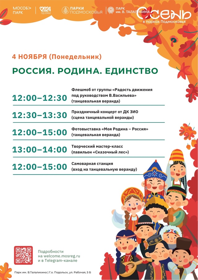 🇷🇺Праздничное мероприятие «Россия. Родина. Единство» пройдёт 4 ноября в Парке культуры и отдыха имени Виктора Талалихина.