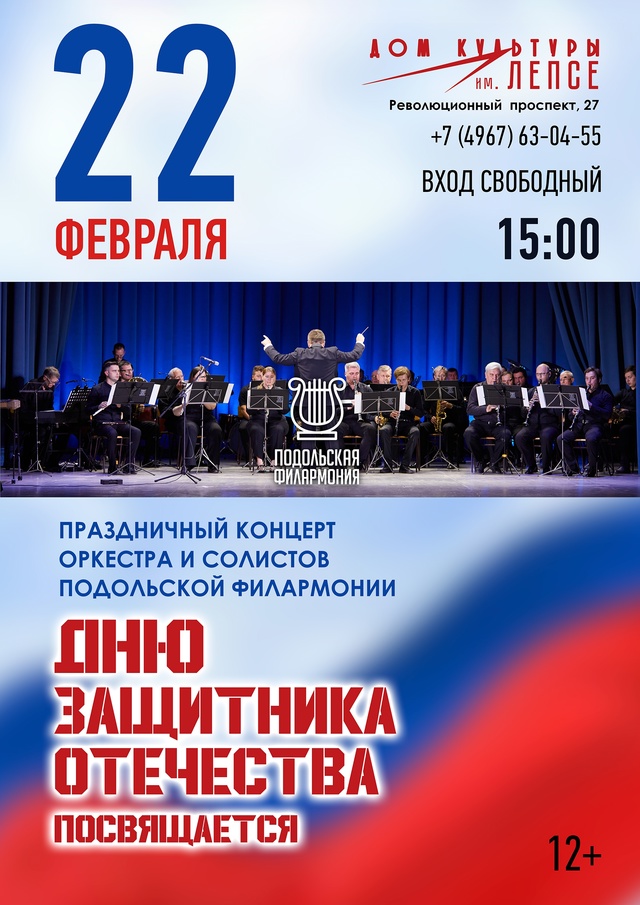 Праздничный концерт The event is finished. Дата 22 Фев 2025 Expired! Время 15:00 Места Дом культуры им. Лепсе. Подольск Г.о.Подольск, Революционный просп., 27 Поделиться событием