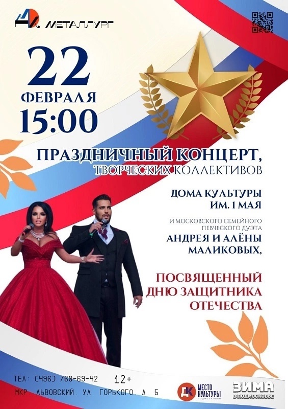 Праздничный концерт The event is finished. Дата 22 Фев 2025 Expired! Время 15:00 Места Дом культуры имени 1-го Мая Заводская ул., 3, микрорайон Климовск Поделиться событием