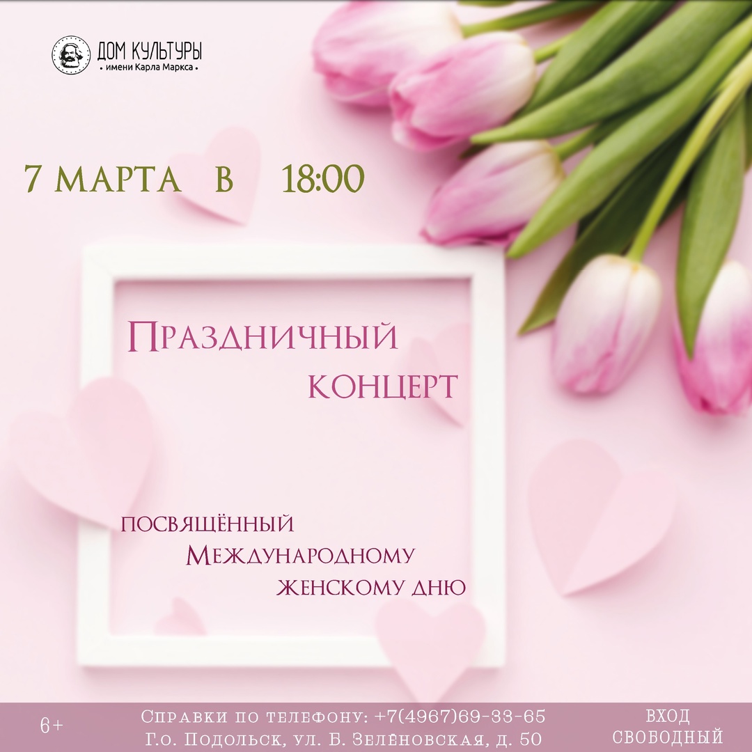 Творческий коллектив Дома культуры имени Карла Маркса приглашает вас на незабываемый праздничный концерт посвящённый Международному женскому дню.