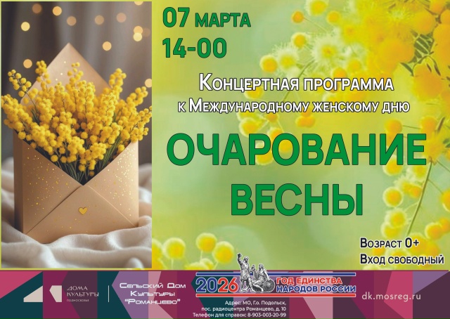 07 марта в 14-00 в преддверии Международного женского дня состоится праздничный концерт «Очарование весны», подготовленный юными артистами МБУК «СДК «Романцево».