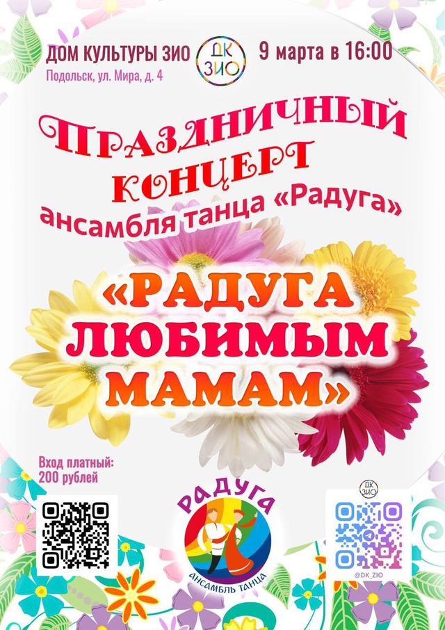💬 9 марта в Доме культуры ЗИО состоится трогательный концерт, посвящённый Международному женскому дню. Юные артисты хореографического ансамбля «Радуга» подарят мамам, бабушкам и всем гостям искренние поздравления: яркие танцевальные номера, улыбки и море тепла! Программа наполнит зал весенним настроением — здесь прозвучат добрые пожелания, любимые мелодии и сюрпризы, созданные детскими сердцами.