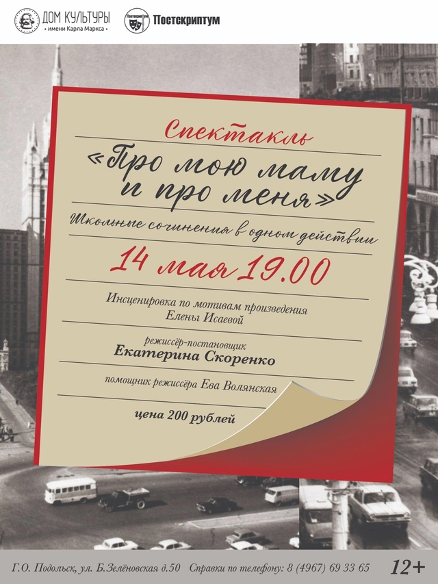 Дорогие друзья! Приглашаем вас на премьеру спектакля «Про мою маму и про меня» в исполнении старшей группы театрального коллектива «Постскриптум».