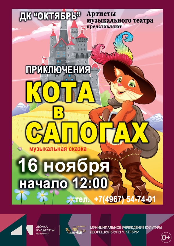 Артисты московского театра оперетты и творческих коллективов Москвы представляют детский музыкальный спектакль по мотивам сказки Шарля Перро «Приключения кота в сапогах». Весёлая игра артистов, зажигательные интерактивные сцены, неаполитанские песни и танцы и, конечно же, яркие костюмы и персонажи сказки не оставят равнодушными юных зрителей и их родителей.