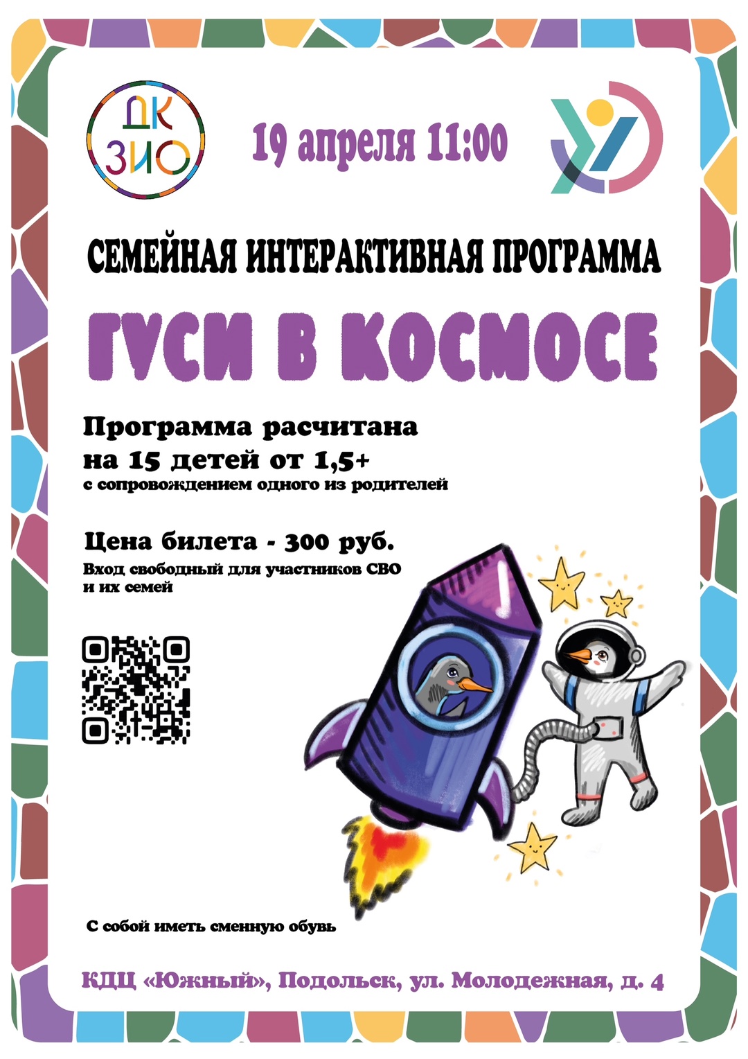 💬 19 апреля в КДЦ «Южный» стартует семейная интерактивная программа «Гуси в космосе»! Юные исследователи вместе с весёлыми гусями отправятся в межпланетное путешествие: будут изучать температуру и поверхность далёких миров, прыгать в «невесомости», примерять скафандры и управлять ракетами. А ещё бабуля-космонавт проведёт мастер-класс, где каждый создаст свою собственную ракету для звёздных приключений. Яркие эмоции, творчество и космические открытия ждут всех участников!