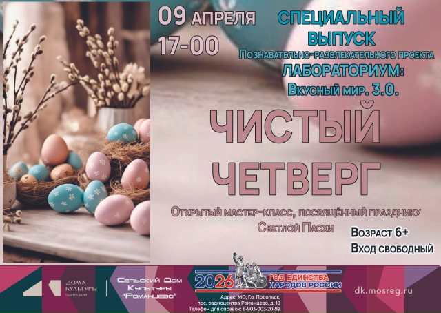 09 апреля в 17:00 состоится традиционный спецвыпуск проекта «Лабораториум: Вкусный мир. 3.0.» под названием «Чистый четверг». Это мероприятие открывает пасхальный цикл встреч, объединяющих детей и взрослых в подготовке к светлому празднику Пасхи.