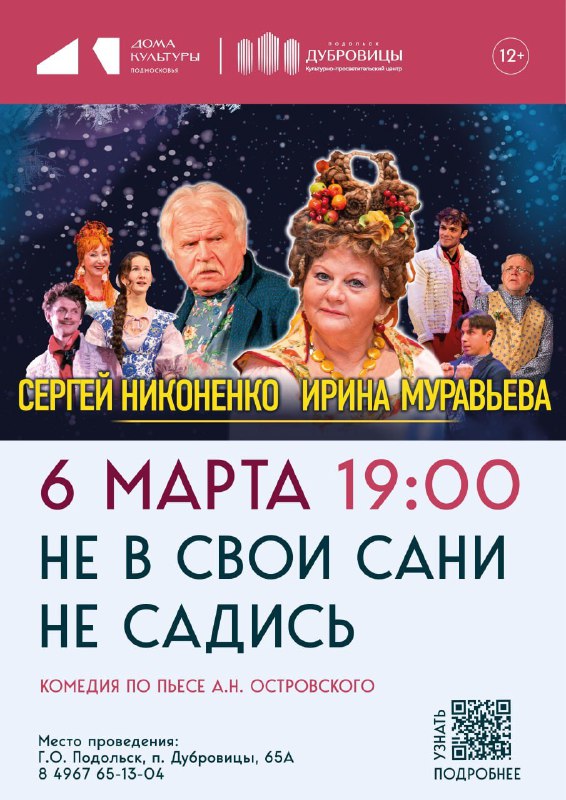 Постановка знаменитой комедии Александра Николаевича Островского «Не в свои сани не садись». На сцену выйдут звезды московских театров, а главные роли исполнят любимые зрителями Народные артисты России – Ирина Муравьева и Сергей Никоненко.