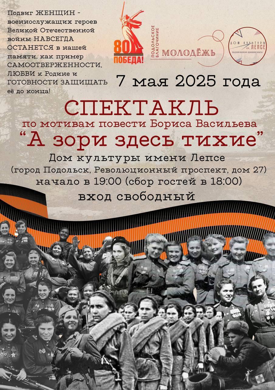 На сцене Дома культуры им. Лепсе состоится показ спектакля молодежи подольского благочиния «А зори здесь тихие». Подольчане представят свое видение повести Бориса Васильева о женщинах-зенитчицах, показавших настоящий пример самоотверженности и мужества.