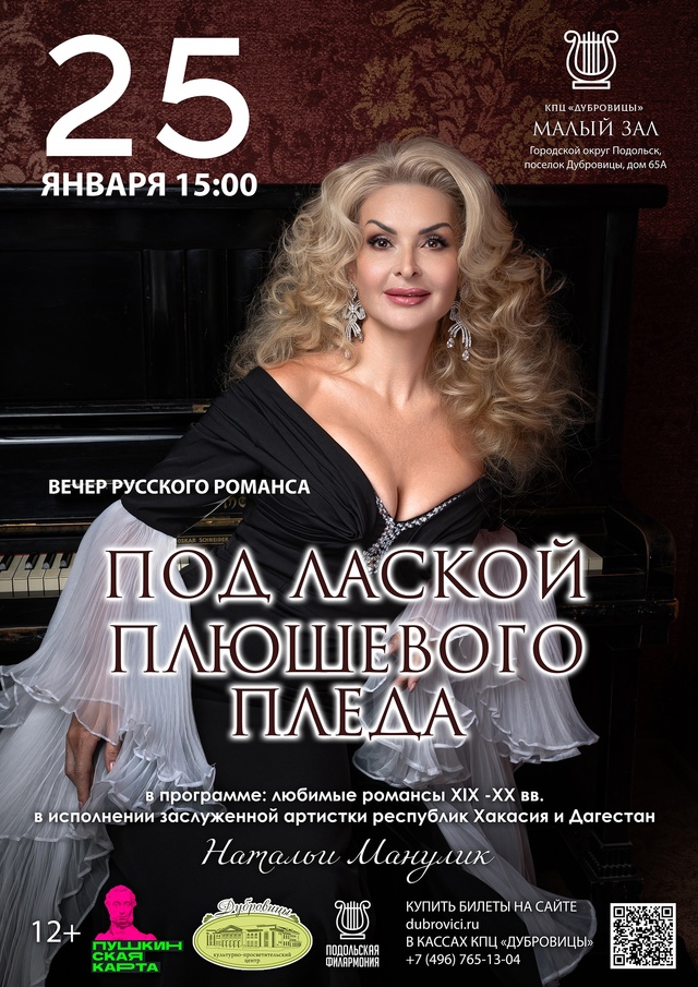 Для вас прозвучат любимые романсы XIX -XX вв. в исполнении заслуженной артистки республик Хакасия и Дагестан Натальи Манулик.