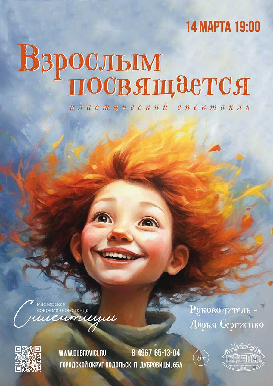 Пластический спектакль представит Мастерская современного танца «Силентиум», руководитель — Дарья Сергиенко. Быть взрослым значит оставить позади суматоху юных лет и твёрдо стоять на ногах, обеспечивать свою жизнь финансово, трезво смотреть на вещи, быть ответственным и независимым. Но знаете ли вы, взрослые, кто вы на самом деле? Удалось ли сохранить былую любознательность, лёгкость и радость жизни? Проникновенные истории объединят нас в единое целое и в этот вечер быть взрослыми вместе будет куда легче.