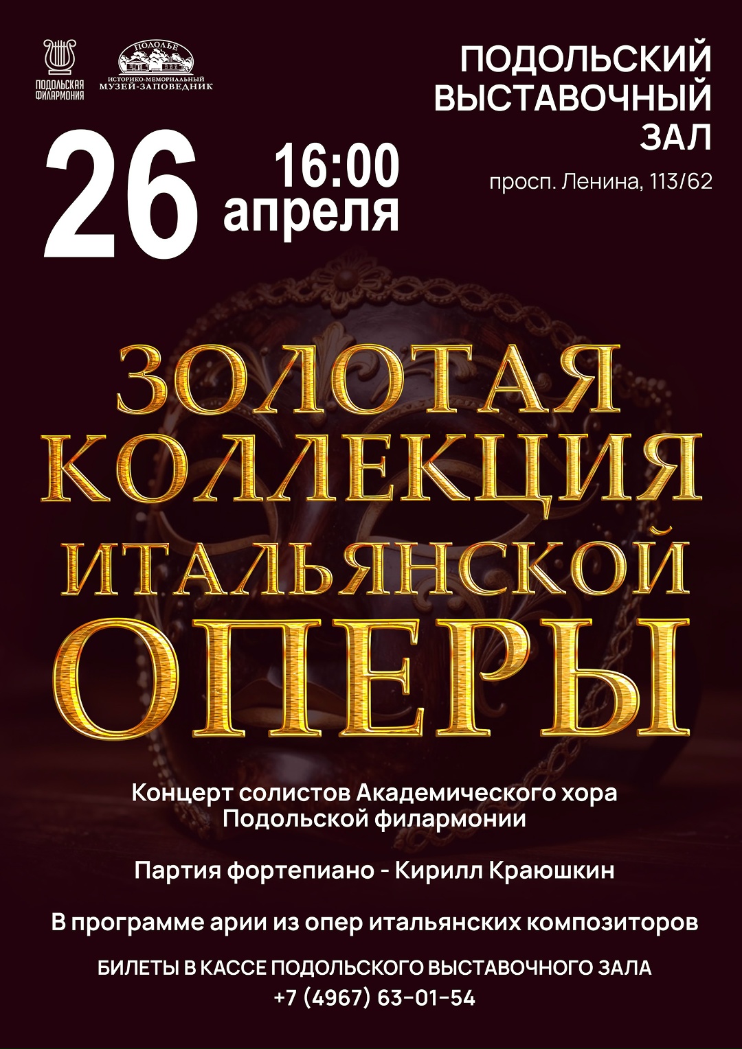 26 апреля 2026 года в 16:00 приглашаем вас в Подольский выставочный зал на концерт, от которого захватывает дух. В программе арии из опер итальянских композиторов.